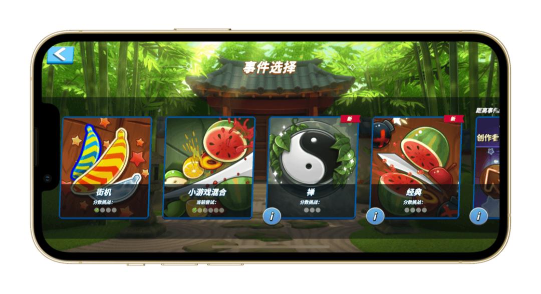 但是要进入游戏,却忽然让我迷糊了。我竟然找不到开始游戏和模式选择的按钮在哪里,熟悉的 BGM 和原来用「切水果」来开始游戏的操作早已消失得无影无踪,只剩下我和这个小人面面相觑。摸索了好一会,才发现原来是「事件」这个按钮。点击进去之后,便会看到熟悉的街机模式了。