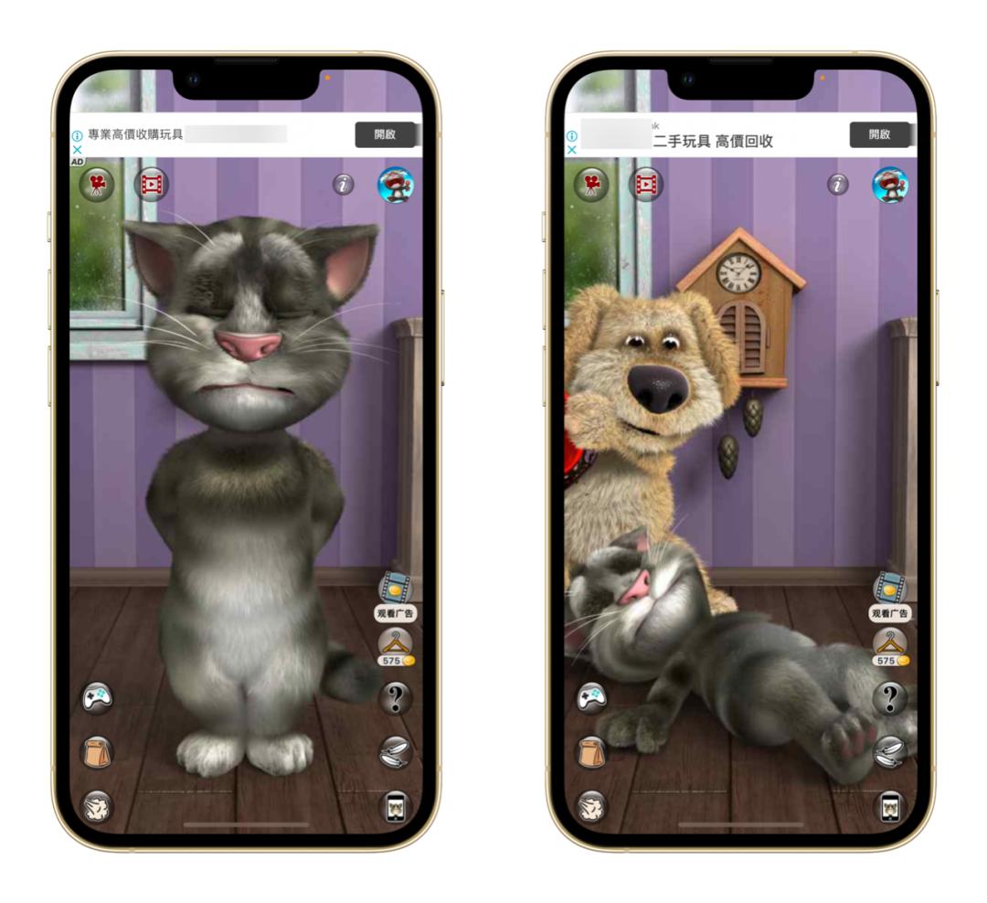 然而也正是因为这个原因,《会说话的汤姆猫》成为了这篇文章介绍的手游中改变最小的一个。除了加入广告和一些道具及装饰的内购外,与 10 年前的版本相比几乎没有任何改变。不过,那些年我们与这只可爱猫咪的各种互动,也算是移动互联网上古时代人类云养猫的铁证了 —— 摸摸它的肚子,还会发出猫咪开心的咕噜咕噜声;而那只大狗,相信你肯定熟悉。