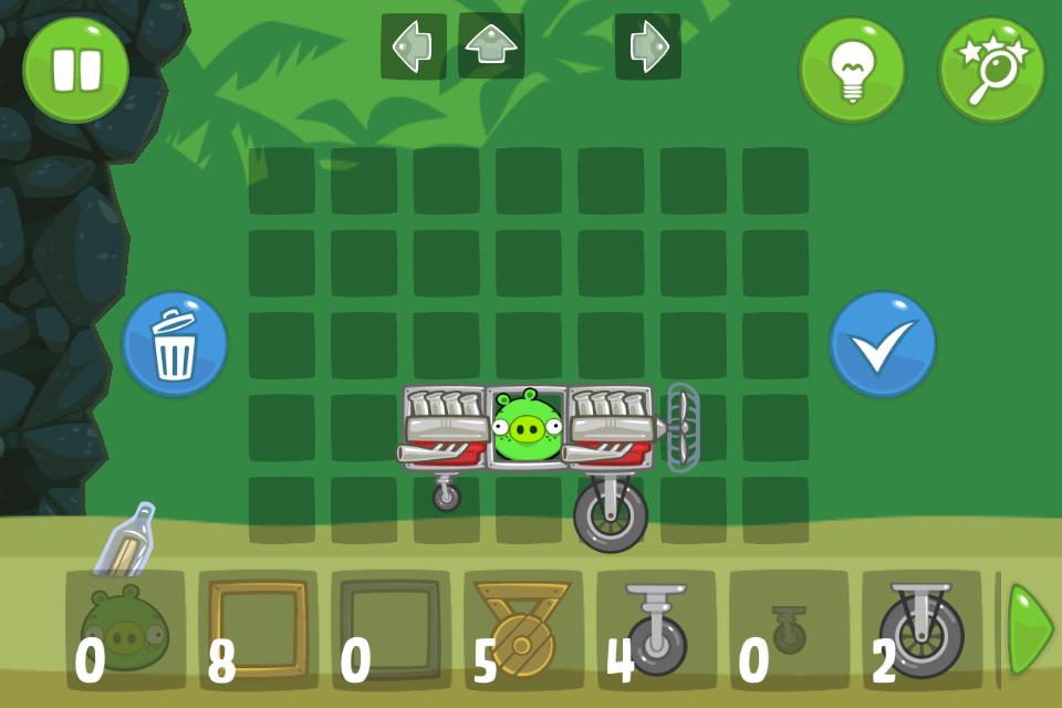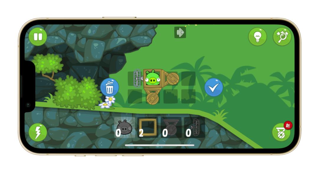 在这 20 多款游戏中,还有一款让我们记忆深刻的,便是与《愤怒的小鸟》相反世界线的《捣蛋猪》。如果说《愤怒的小鸟》操作起来相对简单,那么《捣蛋猪》就算得上是那个年代里少有的烧脑手游。我们不仅要在数量有限的零件中组装出一个可以让小猪从起点移动到终点的工具,而且每个关卡都有不同的任务和装置最大的限定的方格。