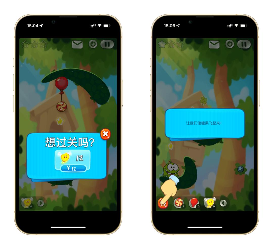 在完成第一关之后,旁边就出现了一个「免费道具」的按钮,瞬间让我有了不祥的预感。然后当我点击重新开始本局游戏的按钮之后,画面中立刻就弹出了一个「想过关吗」的按钮,只需消费 12 元即可。而当你进行了错误操作,吃不到所有的道具星星之后,购买的提示又再次出现,告诉你糖果还可以再用气球吊飞起来。