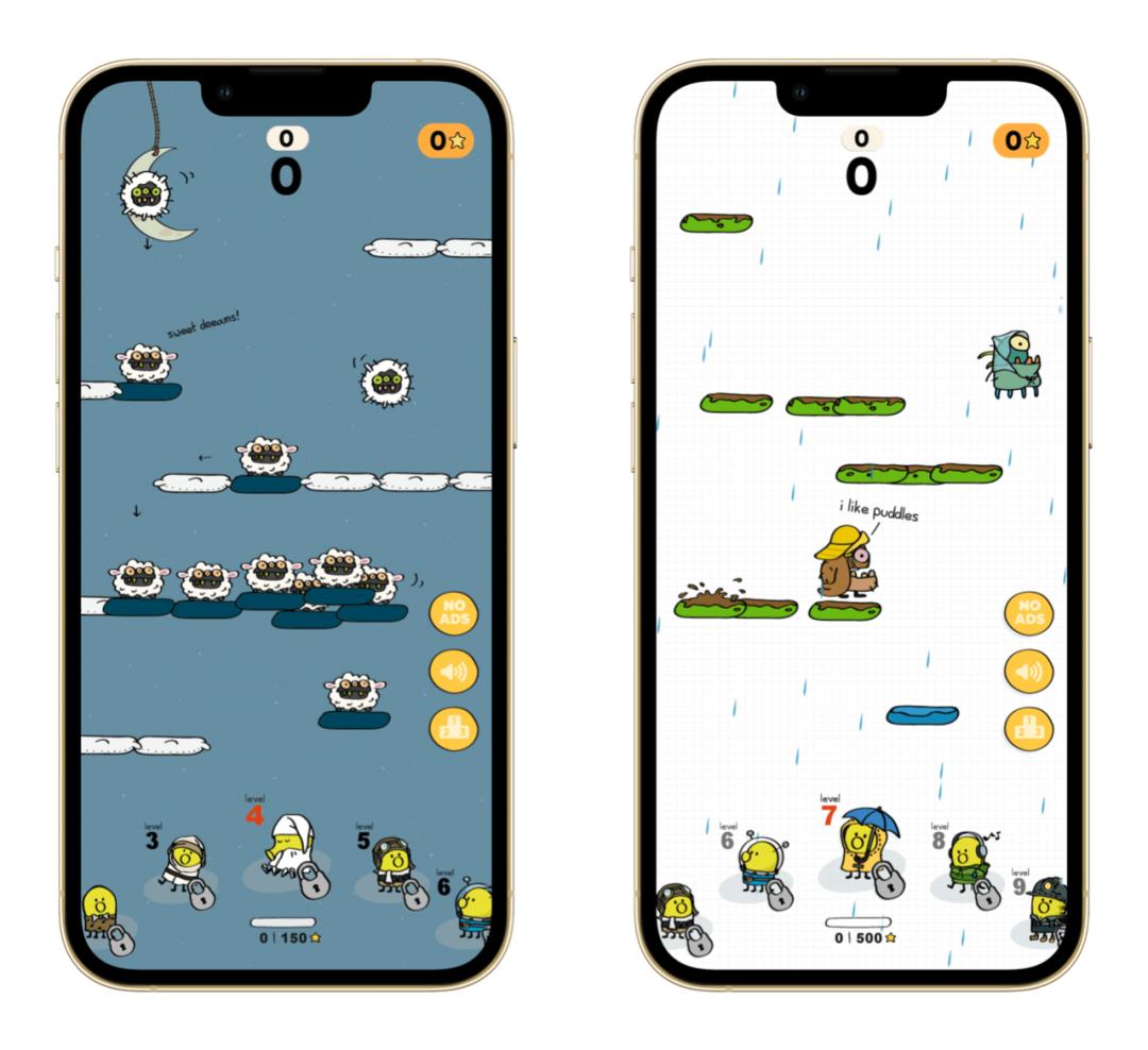 《涂鸦跳跃》的玩法相信不必再介绍,依然也是 12 年前的操作。不过在如今的版本中,加入了许多以前所没有的道具和陷阱,同时还引入了场景解锁机制。在最新一版的《涂鸦跳跃》中一共内置了 9 个场景,让我印象比较深的是深夜和雨天,背景音效甚至还有自带白噪音的效果。或许 Lima Sky 觉得,《涂鸦跳跃》这种简单且直观的小游戏,用来作为睡前放松的娱乐是最合适不过了。