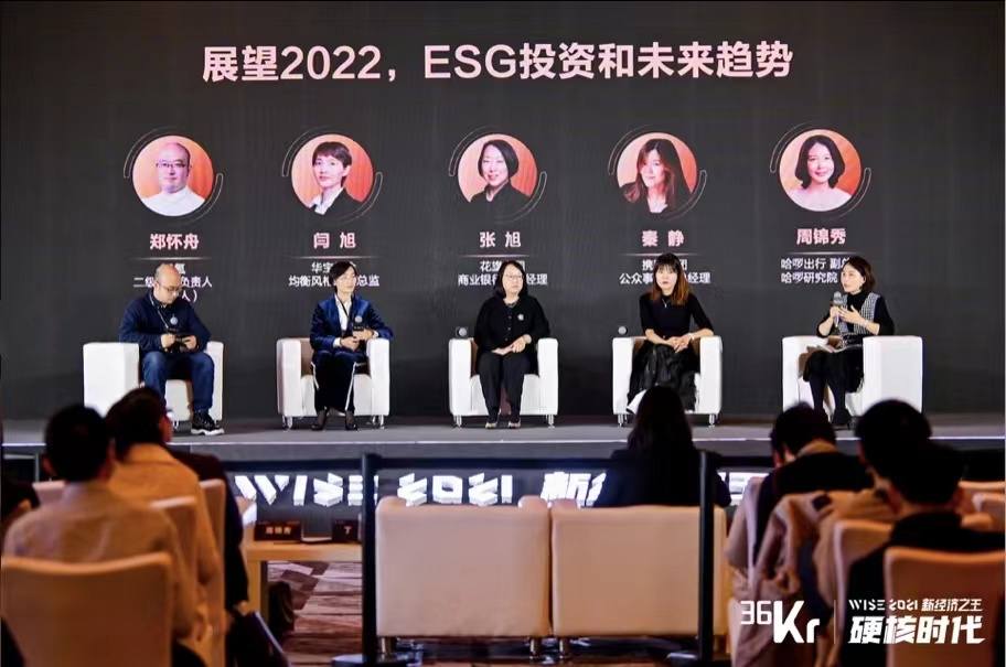 12月13日,36氪“WISE2021新经济之王资本市场高峰论坛”在上海举行。在主题为“展望2022,ESG投资和未来趋势”的圆桌论坛环节,36氪二级市场负责人郑怀舟作为主持人,与华宝基金投资总监闫旭、花旗中国商业银行部总经理张旭、携程集团公共事务部总经理秦静以及哈啰出行副总裁、哈啰研究院院长周锦秀共同探讨了“双碳”背景下的未来趋势。
