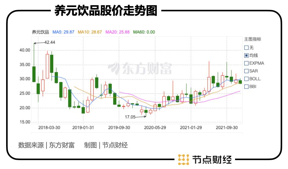 资本市场的表现同样不甚乐观。自2018年初在上交所主板上市起,养元饮品就开启了“跌跌跌”模式,如今股价仅为29.26元/股,较78.73元/股的发行价已缩水大半,距离113.37元/股的历史高点更是相距甚远。