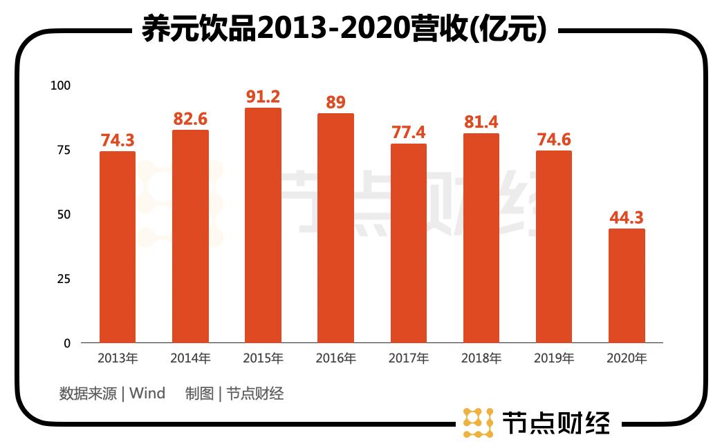 但从2015年后,养元饮品的高成长性戛然而止,并随之进入了下滑通道。2016年-2019年,公司营收分别为89.0亿元、77.4亿元、81.4亿元、74.6亿元,缓中有降;2020年,受新冠疫情等多方因素的影响,养元饮品的营收仅达到44.3亿元,相对2019年可以说是接近腰斩。