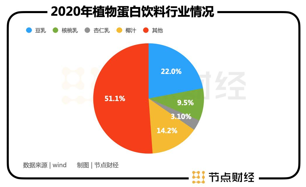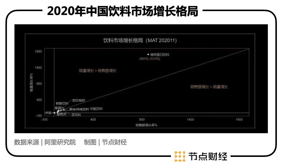 另据天猫新品创新中心发布的《2020植物蛋白饮料创新趋势》,2020年植物蛋白饮料行业迎来爆发,销售额增长率达到965%,销量增长率达到1810%,购买人数增长9倍,远超其他饮料品类。