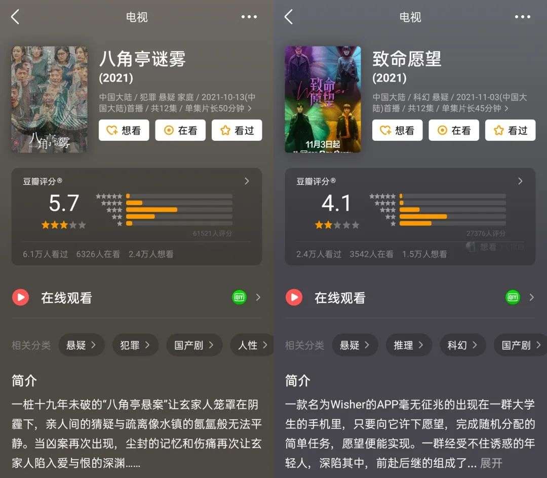 爆款剧集一度以来是爱奇艺综艺外的另一个杀手锏。《沉默的真相》《隐秘的角落》等爆款剧集,让爱奇艺的迷雾剧场一炮而红,有爱奇艺的员工透露,迷雾剧场为爱奇艺带来了可观的广告营收。但被高管们寄予厚望的迷雾剧场,却遭遇了滑铁卢,《八角亭谜雾》豆瓣5.7分,《致命愿望》4.1分,对比去年可谓是惨败收场。