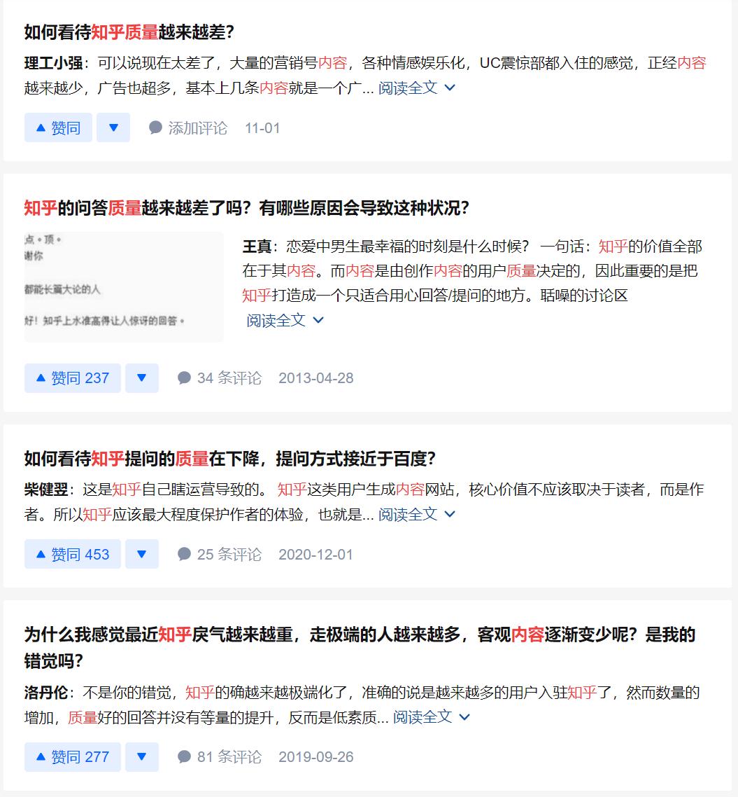 在内容管理上,知乎就面临很大的烦恼:在知乎问答社区内,类似“如何看待知乎内容质量越来越差”、“住户提问质量在下降,提问方式接近于百度”、“为什么知乎戾气越来越重,客观内容越来越少”等问题从未断绝。