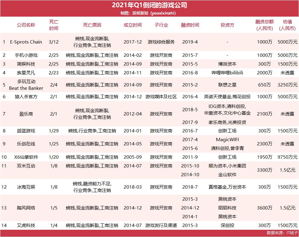 从另一份数据来看,IT桔子统计了2021年Q1倒闭的40家游戏公司,其中获得融资的有14家,占比达到35%。虽然数据尚不完整,但对比去年的26%还是高出了不少。