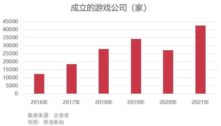 似乎大批的公司筛选并没有令游戏圈的热潮降温。同样基于企查查数据,2019年以前的每年新成立的游戏公司数量在上升,2020年有所回落,整体趋势和倒闭的数量一致。今年不太一样的是,成立的游戏公司没降反升并突破了4万家,是近五年来的峰值。