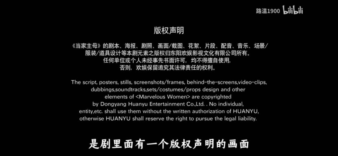 于正出品的《当家主母》就在片中标注了“版权声明”,禁止擅自使用剧本、海报、剧照、画面、花絮、配音、片段、音乐、场景等所有剧集相关元素。