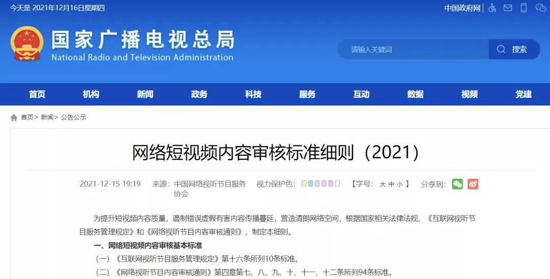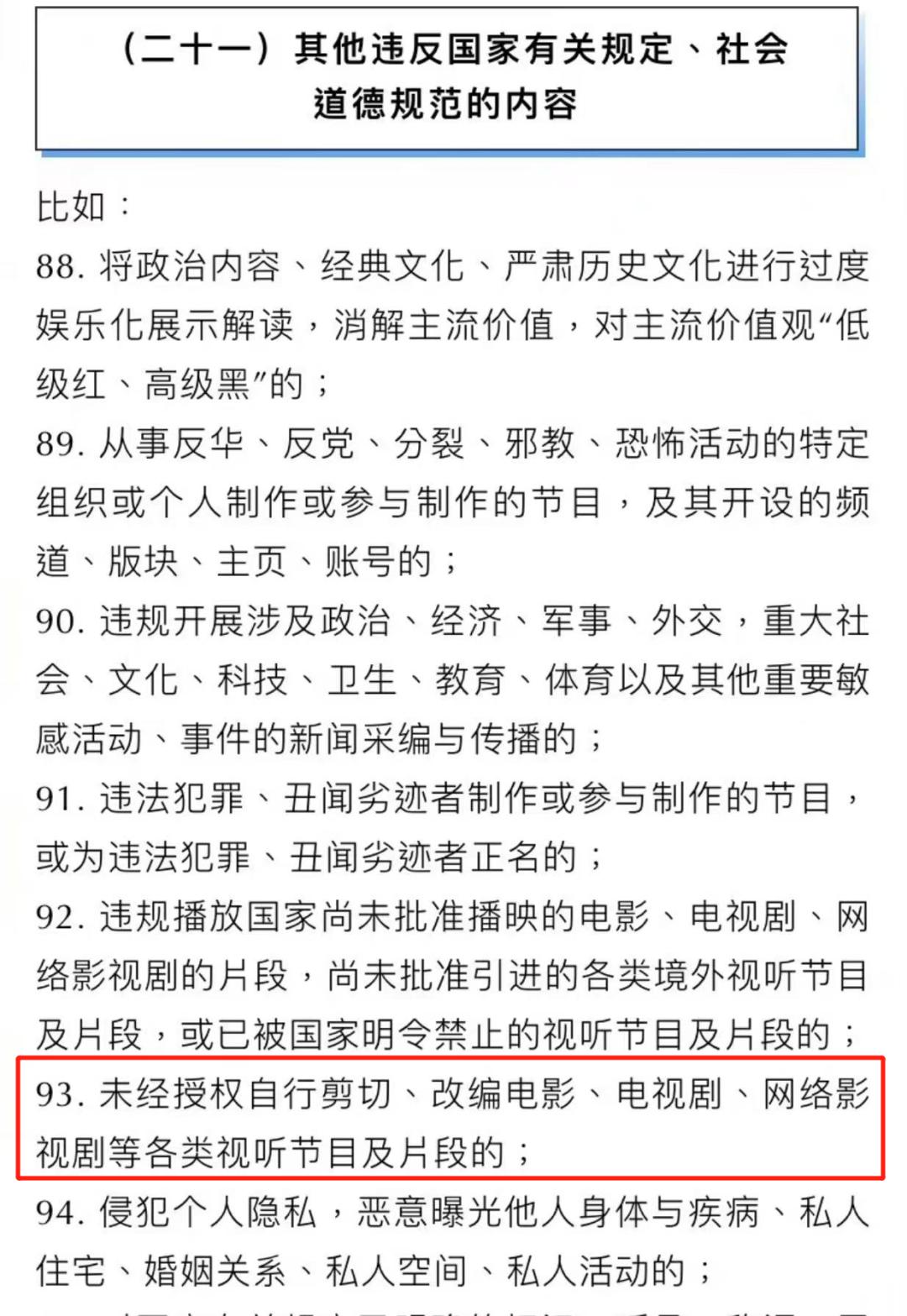 12月15日,中国网络视听节目服务协会发布了《网络短视频内容审核标准细则》(2021),覆盖21个大类共100条规范。其中第93条尤为瞩目: