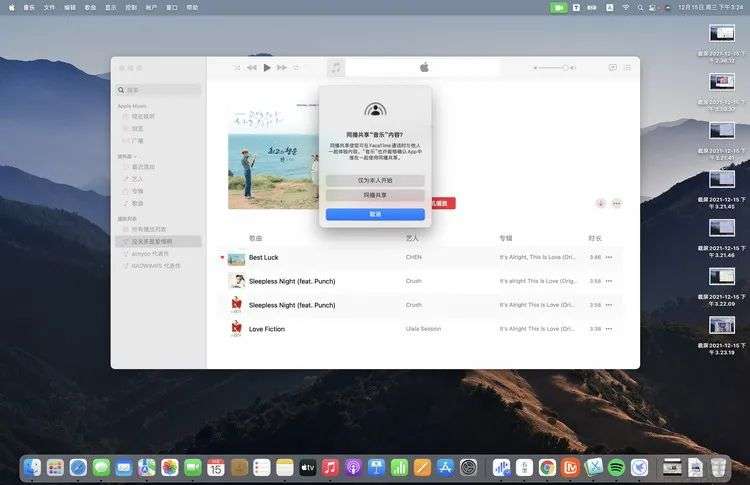 在这里,目前国内消费者最容易接触到的例子,就是跨设备使用Apple Music与好友一起听歌。正如大家所看到的那样,当我们在FaceTime通话的过程中打开Mac、iPad,或iPhone上的Apple Music时,系统就会自动提示是否需要共享音乐。在选择“是”之后,当前处于同播共享状态的多台设备,都会启动本机上的Apple Music应用,并以相同的进度播放相同的音乐。