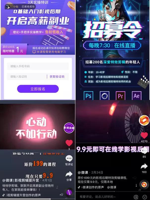 又像在《影视后期培训班的财富密码:学员靠购课就能买未来?》一文中写到,上班族孙芸了解到的那样,部分影视剪辑博主推出视频后的播放量、点赞量、评论量等数据,在一定程度上佐证了很多“0基础学剪辑”的可行性,也验证着它们打出的那些极具诱惑力的宣传语,“影视剪辑是目前平台流量最大、涨粉最快、变现渠道最多的一种账号,而且简单好学,人人都能参与,只需要每天两到三个小时,就可以开启月入过万的创业之路了。”