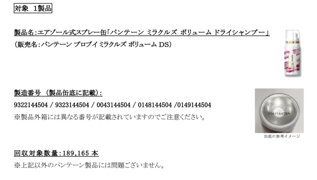 日本宝洁于昨日(12月18日)在其官网发布了涉案产品的召回通知,召回产品近19万瓶,主要为在美国制造的部分潘婷气溶胶式喷雾罐产品,因其检测出了不作为成分配合的苯。