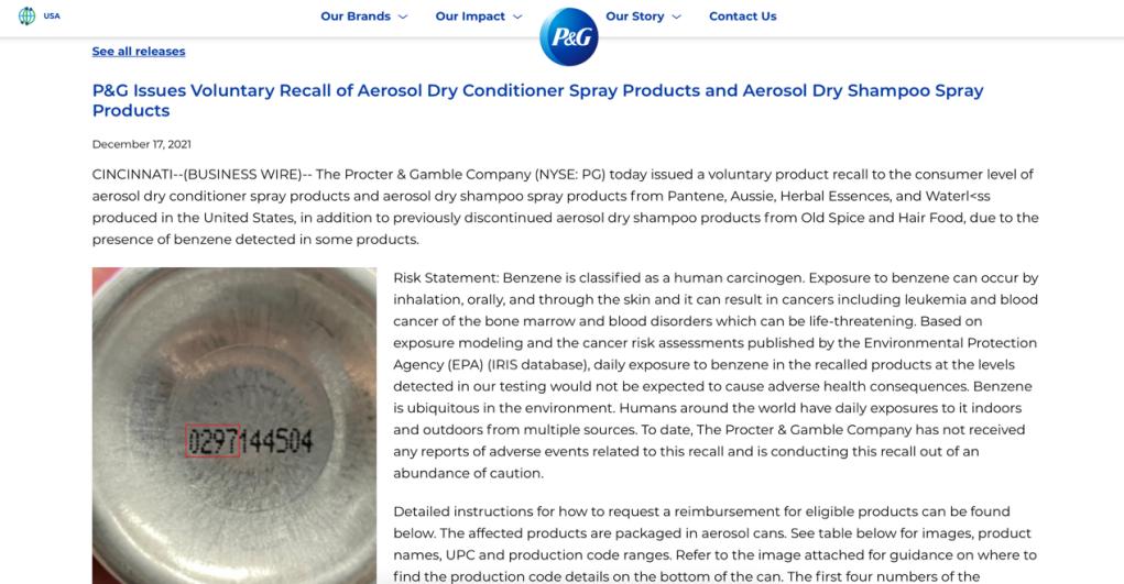 但宝洁也特别指出,“根据环境保护局(EPA)(IRIS数据库)发布的暴露模型和癌症风险评估,按照我们测试中检测到的水平,召回产品中每天接触苯不会对健康造成不利影响。苯在环境中无处不在……迄今为止,宝洁公司尚未收到任何与此次召回相关的不良事件报告。”