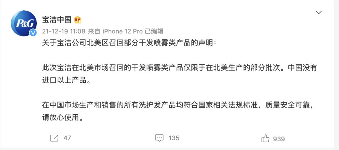 对此,宝洁中国第一时间在官方微博发布了声明。声明指出,此次宝洁在北美市场召回的干发喷雾类产品仅限于在北美生产的部分批次,中国没有进口以上产品。