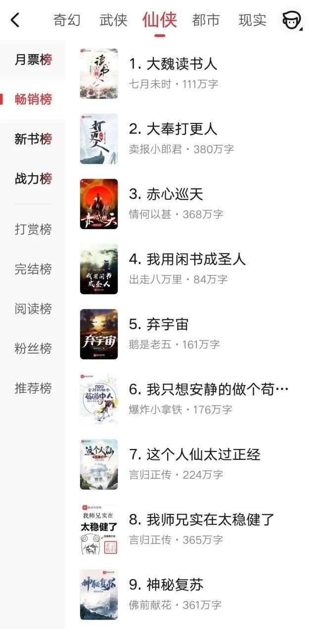 更加离谱的事情发生在《大奉打更人》完结 得 两个月后,《大魏读书人》一举将《大奉打更人》拉下马来并顺势跃居第一。