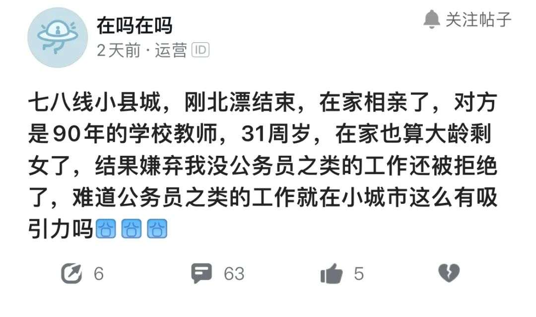 还留在老家的单身青年,多半是公务员或者教师编。“不是我不想接触机会,”许茹解释道,“体制内的男生多半喜欢小学教师等等工作稳定的女生,事少离家近,共同生活的时间多。”