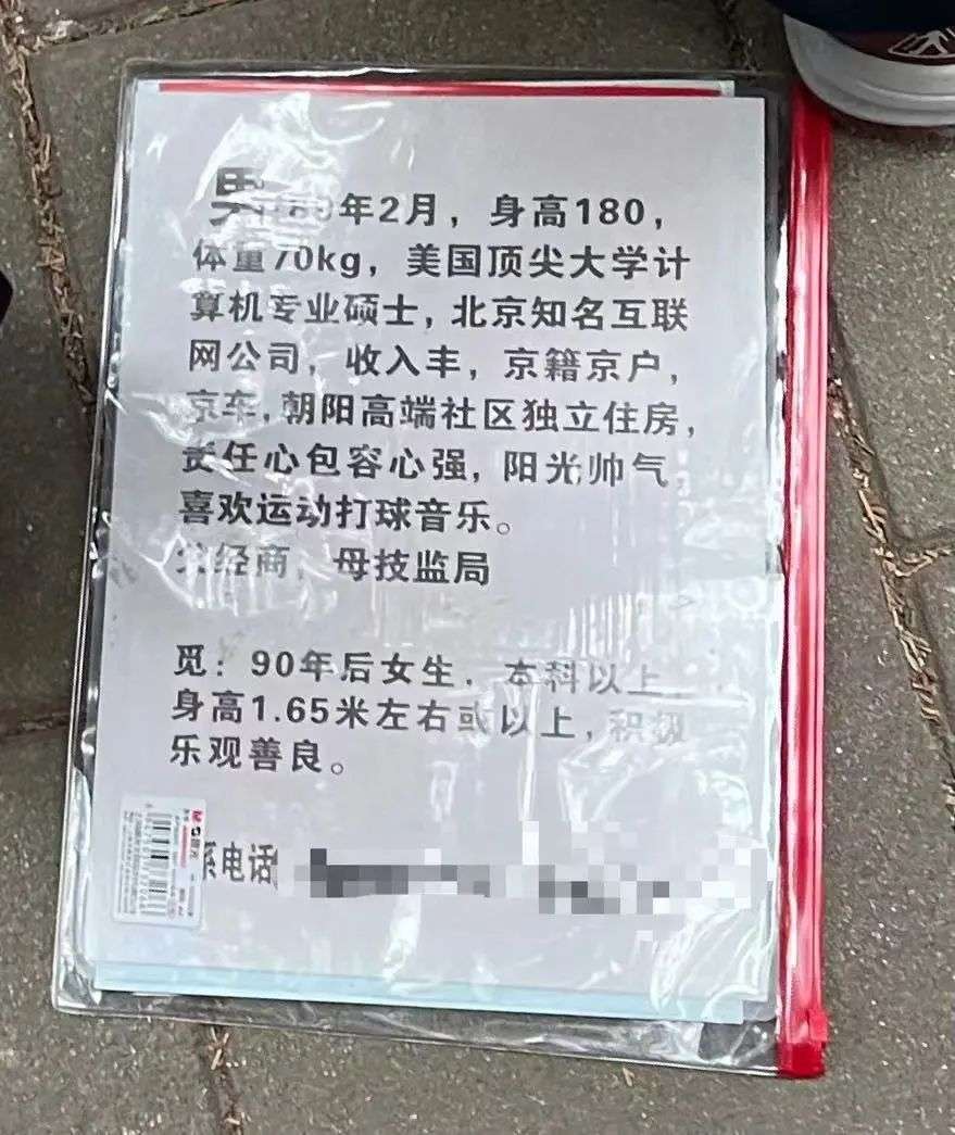 章国伟的身高信息和工作学历背景被列在一张A4纸上,放在海淀公园相亲角的入口。“我们不看女方工作,”章国伟妈妈满脸自豪地在给围观的人展示手机里儿子的大头照,“互联网收入高,姑娘婚后全职带孩子都行。”