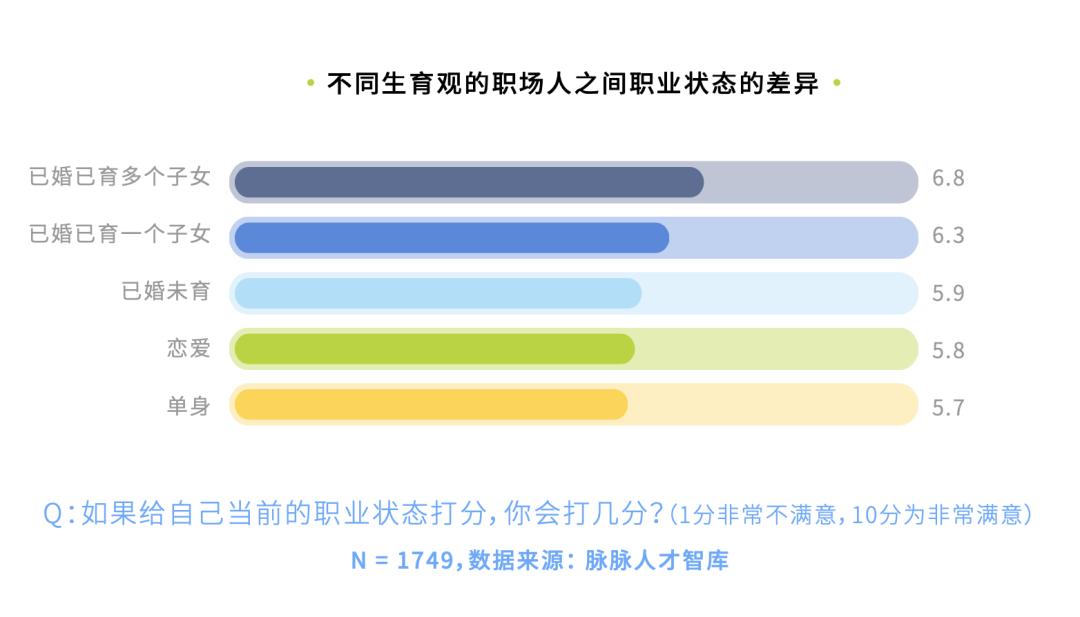 报告数据也显示,职场满意度最高的群体,是已婚已育的职场人。婚育状态和职场满意度呈现正相关,但因果为何,“多子多福”该如何理解,大家各有解读。