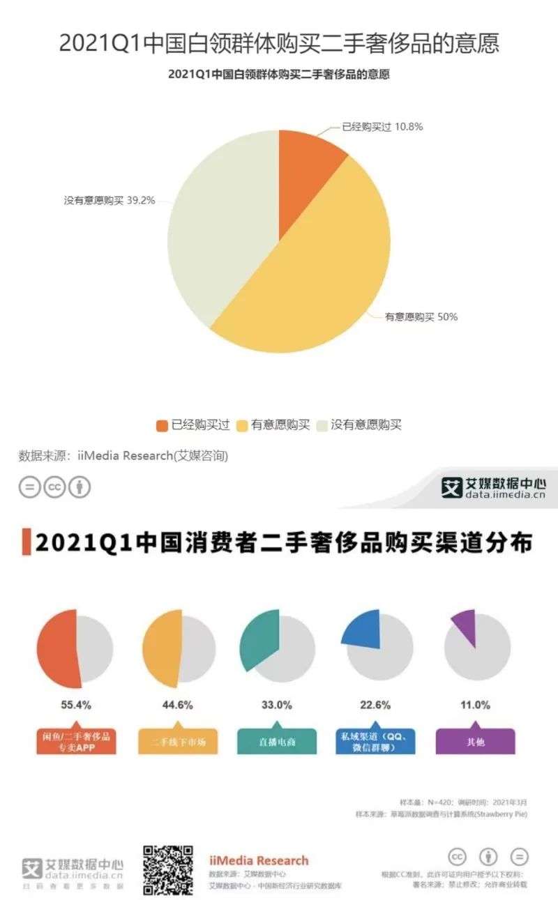 iiMedia Research数据显示,2021年Q1,10.8%白领群体已经购买过二手奢侈品,另有50%白领群体具有购买二手奢侈品的意愿。在购买渠道方面,2021年Q1,约有55.4%的消费者通过二手奢侈品交易平台购买二奢品,在线下渠道购买的消费者占比为44.6%;而其中,通过直播电商购买二奢品的消费者占比达33%。