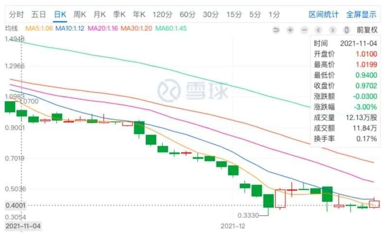 与业绩疲软相伴的,是寺库低迷的股价与大幅缩水的市值。2021年11月4日,寺库股价首次跌破1美元,收报0.97美元/股;截至12月17日,寺库收盘报0.4297美元/股,市值仅剩约3千万美元,较上市首日蒸发超九成。