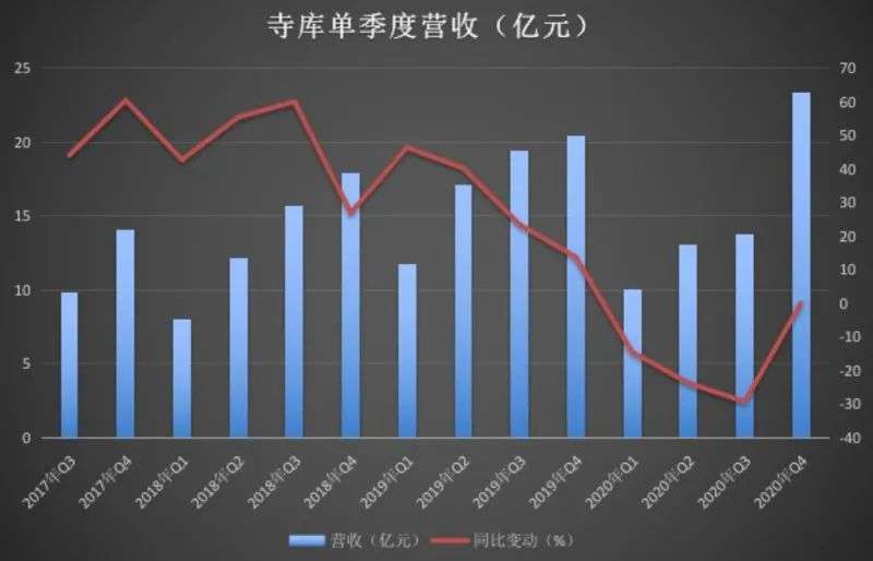 而实际上,寺库早已显露出业绩疲软的迹象。据其此前发布的财报数据,2019年Q1至2020年Q3,寺库的营收同比增速从46.47%逐季降至-29.26%,呈单边下行态势;2019年Q4至2020年Q4,寺库的归母净利润则连续5个季度同比下降,最大降幅为397.91%。