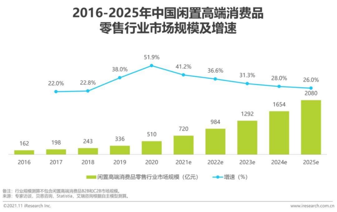 艾瑞咨询发布的《2021中国闲置高端消费品零售行业研究报告》指出,2016年中国闲置高端消费品零售行业市场规模为162亿元,2020年受益于直播电商形式加持,市场规模达到510亿元;艾瑞预计,到2025年这一市场规模将达到2080亿元。
