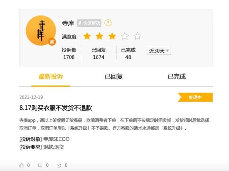 与此同时,记者注意到,在贴吧、黑猫投诉、微博等平台上,近期有关寺库不发货、不退款、不退货的投诉尤其集中。以黑猫投诉为例,在截至12月19日的近30天,该平台上有关寺库的投诉量超1700条,其中有大量用户反馈寺库平台逾期未发货、申请退款无人处理。