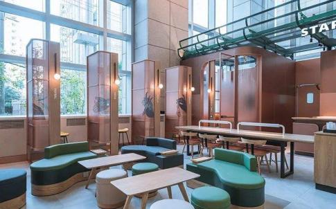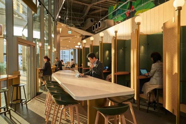 这家 星巴 克门店以咖啡为载体,不仅解决当下职场人群灵活办公和商务社交空间的需要,还可以在专属的私密空间里工作或开会。