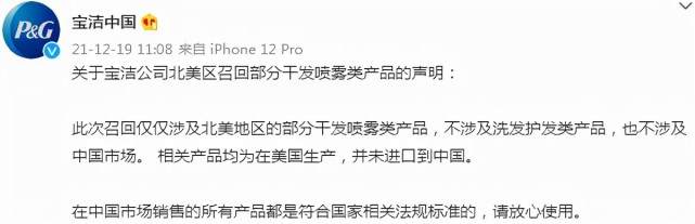 在中国市场销售的宝洁产品安全吗?在事发后,宝洁中国第一时间通过官方渠道声明,出问题的产品只涉及北美地区,中国销售的产品都是符合国家法规标准的。