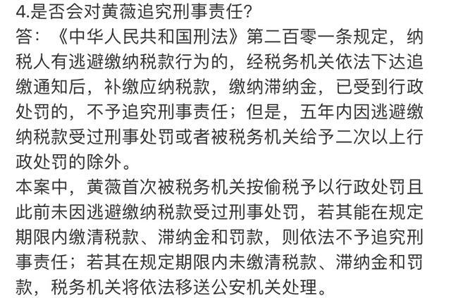 在税务调查过程中,黄薇能够配合并主动补缴税款5亿元,同时主动报告税务机关尚未掌握的涉税违法行为。