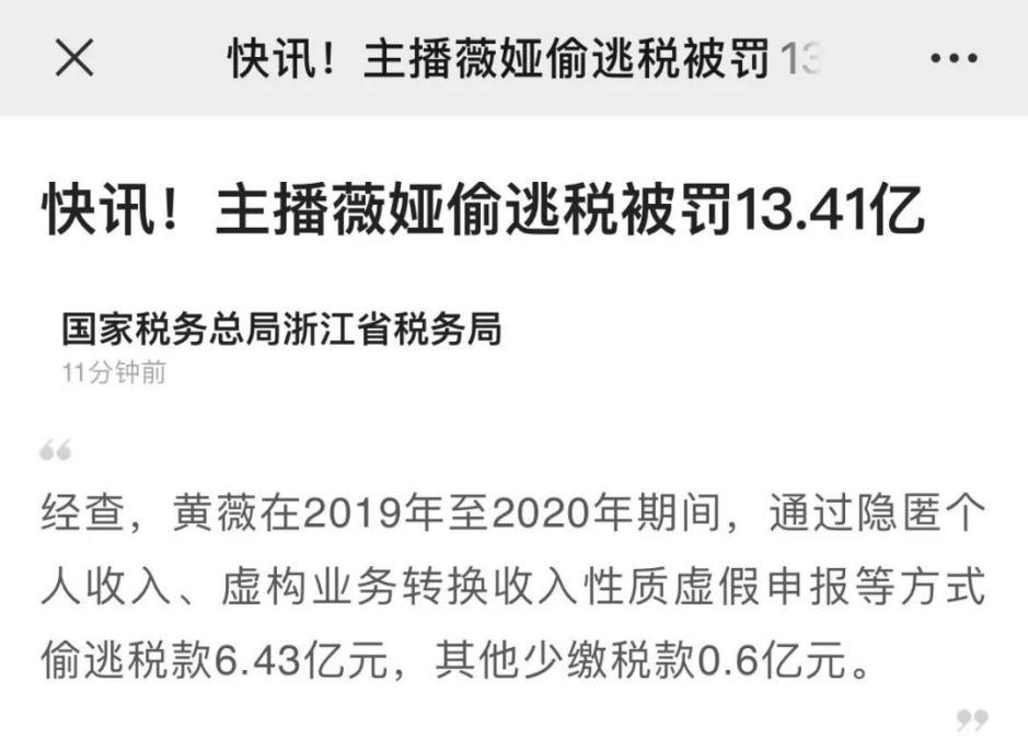 起因如下,近期,浙江省杭州市税务部门经税收大数据分析发现网络主播黄薇(网名:薇娅)涉嫌偷逃税款,在相关税务机关协作配合下,依法对其开展了全面深入的税务检查。