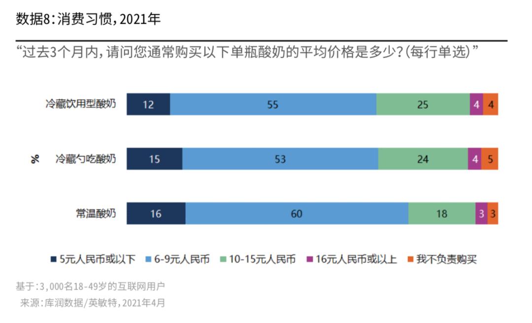 小食代今天从英敏特2021年中国酸奶市场报告获悉,与2020年的调研结果一致,无论是冷藏饮用型酸奶、冷藏勺吃酸奶,还是常温酸奶,大多数消费者通常花费6-9元人民币购买单瓶酸奶,表明了这个价位的巨大市场潜力。