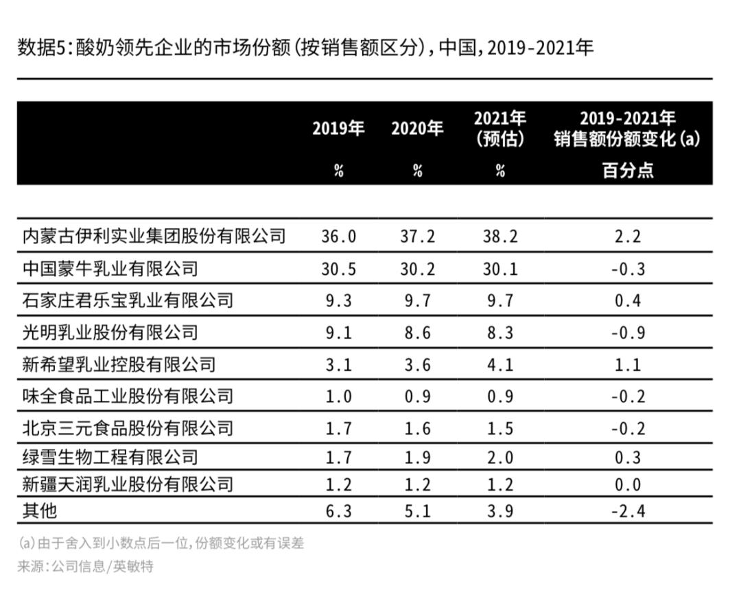 而从企业来看,英敏特数据显示,2019年-2021年期间,在中国酸奶市场稳居前列的“三巨头”分别是伊利、蒙牛和君乐宝,预计2021年按销售额计算的市场份额分别为38.2%、30.1%和9.7%。
