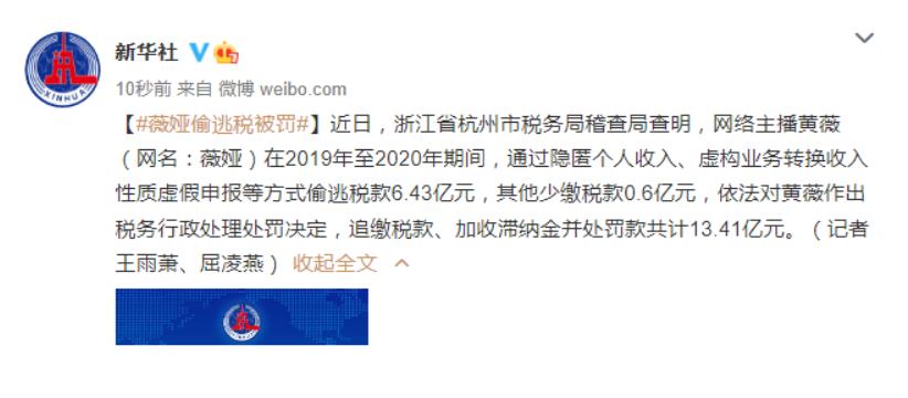 2018年某艺人因逃税被处以共计8.9亿元的追缴税款和罚金,创下了当时的处罚新纪录。但就在2021年12月20日下午,一位黄姓网络主播成功刷新了这个纪录。根据税务部门公布的处理结果:黄薇(薇娅)通过隐匿个人收入、虚构业务转换收入性质进行虚假申报偷逃税款,被依法追缴税款、加收滞纳金并处罚款,共计13.41亿元。
