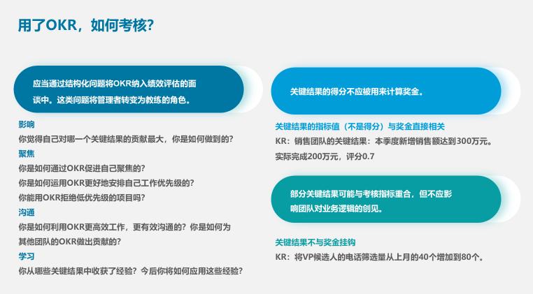 实际上,OKR应当与绩效管理产生关联,只是要区分具体关联的环节和关联方式。绩效管理包括四个部分,依次是目标设定、跟踪监控、考核评估与反馈应用。而OKR的实施过程是可以与绩效评估结合起来的。方式不是用标尺去衡量业绩达没达标,而是将关注点聚焦在“人”,目的是去评估是否“人尽其才”。一个推荐的方式是在绩效评估的面谈中运用以一系列结构化的问题,帮助管理者转变角色,成为教练型管理者。