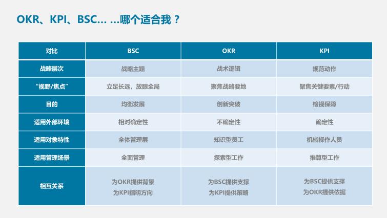 另一个绕不开的话题,就是对于战略分解与目标管理工具的对比,我们可以对BSC(Balanced Score Card,平衡计分卡)、KPI和OKR作一个简要对比: