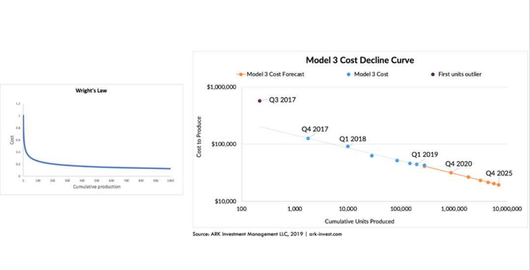 右边这组曲线是2019年投资机构ARK对特斯拉Model 3成本曲线的预判。随着Model 3累积产能的增加,边际成本将不断下滑。按经典规模效应的预判,到2025年,Model 3的成本将会下降到1万-2万美元区间。