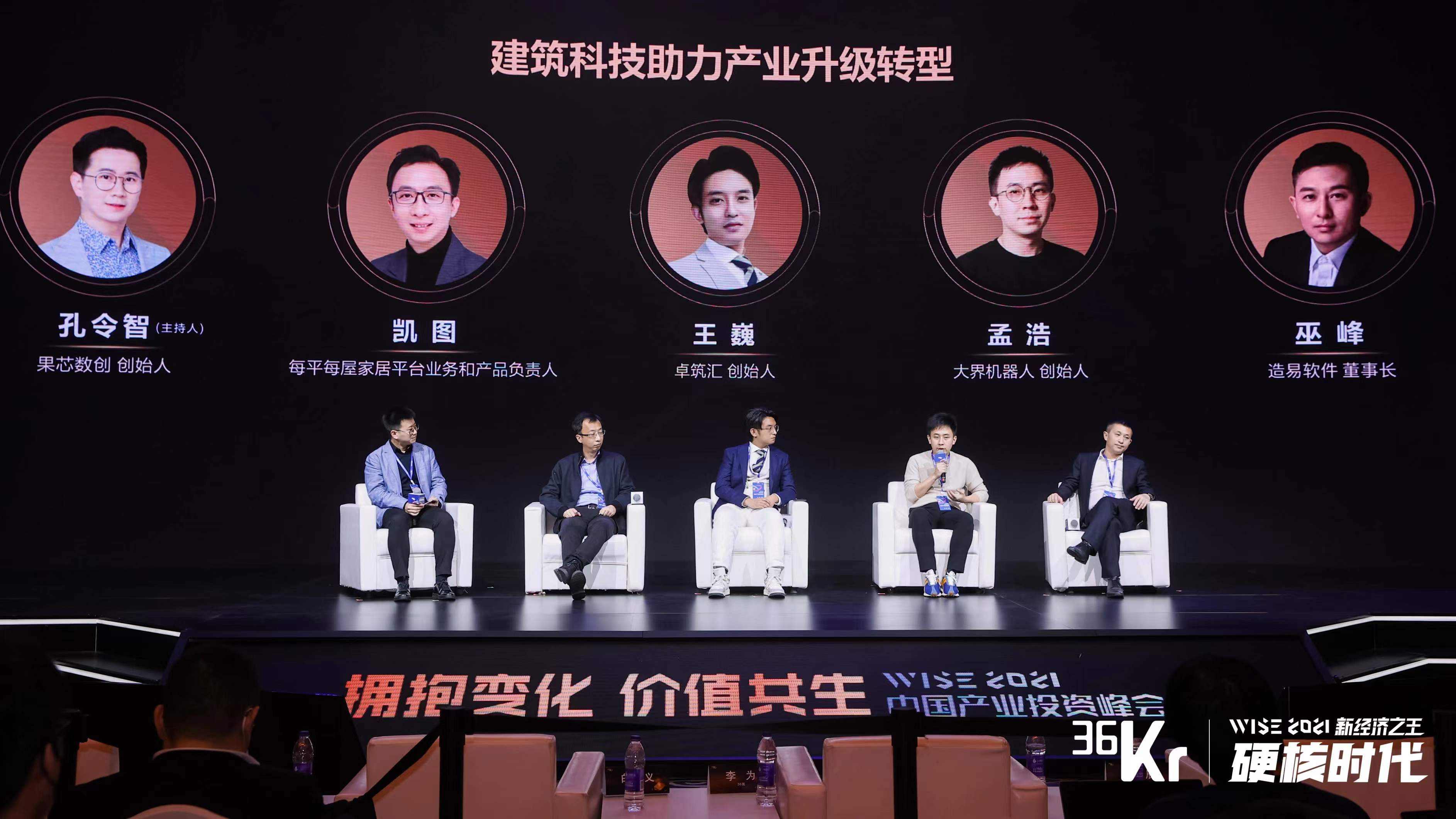 基于此,一场以“建筑科技助力产业升级转型”为主题的圆桌论坛在36氪“WISE 2021中国产业投资峰会”展开。参与本场论坛的嘉宾有每平每屋家居平台业务和产品负责人凯图、卓筑汇创始人王巍、大界机器人创始人孟浩、造易软件董事长巫峰,本场论坛由果芯数创创始人孔令智主持。