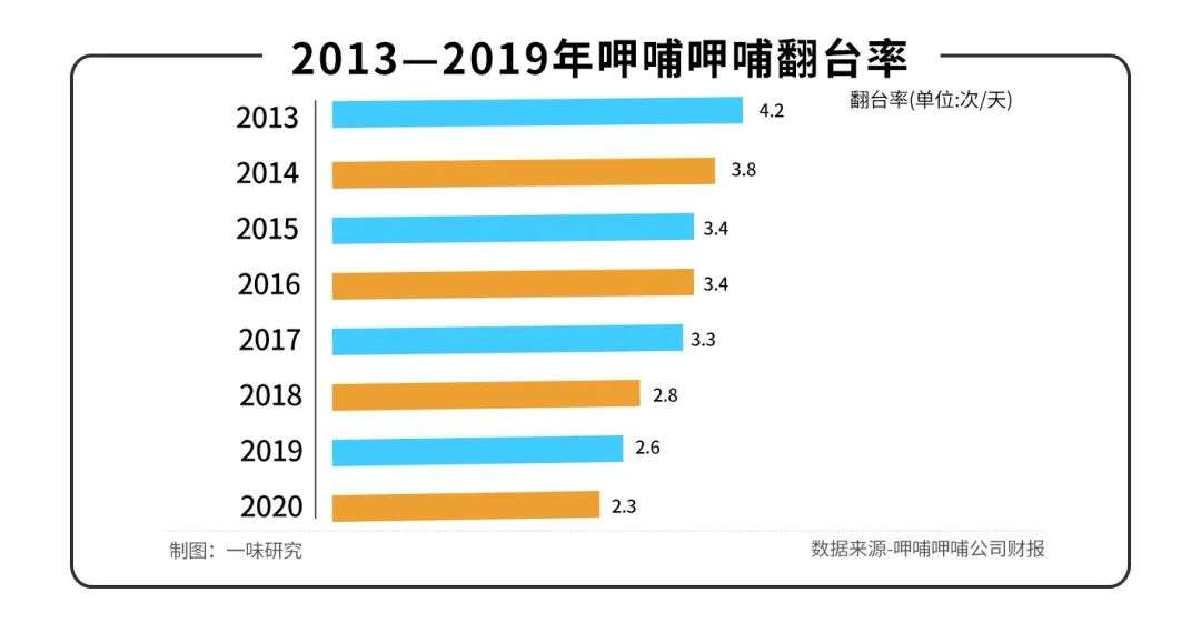 不仅如此,呷哺呷哺的翻台率也在逐年降低。财报数据显示,呷哺呷哺翻台率从2013年的4.2倍一路降至2020年的2.3倍。