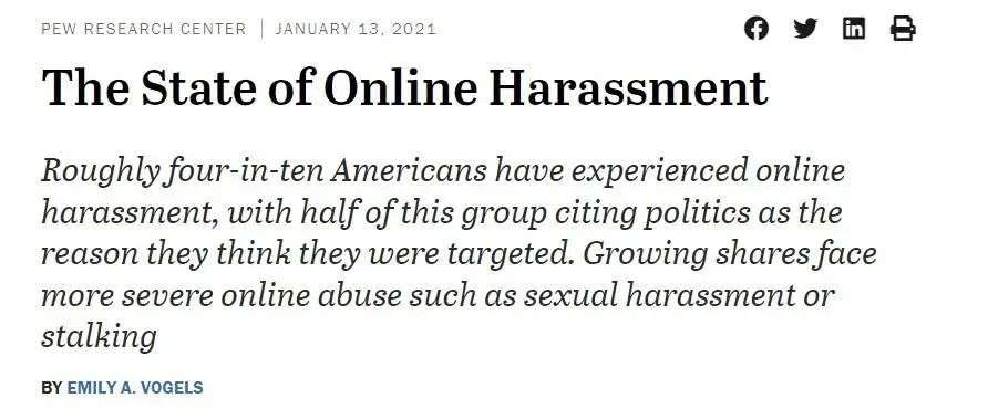 皮尤研究中心今年 1 月发布的调查显示,40% 的美国成年人曾经历过网络骚扰,25% 经历过更严重的骚扰,包括身体威胁、跟踪、性骚扰和持续骚扰。