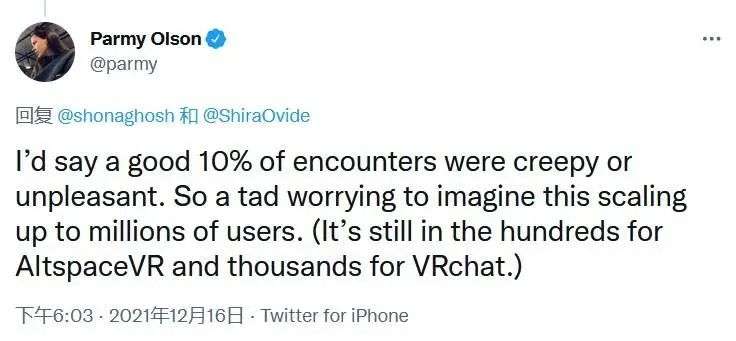 可当她登录时,一小群男性化身围绕在她身边,有几个人开始给她拍照,「这种经历很尴尬,我觉得自己有点像标本」。但并非所有的虚拟体验都是不好的,她在 Twitter 表达了自己真正担心的事情: