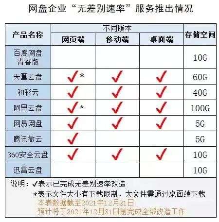 阿里云盘、天翼云盘、360安全网盘、和彩云、网易网盘等完成“无差别速率”服务改造