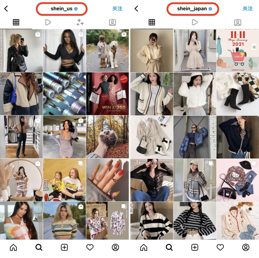 在各大社交媒体上,SHEIN会建立20多个子账号,做更细分的内容。比如他们会根据当地的文化特色选择适合的服装风格。其在日本账号发布的服装风格是甜美、内敛的;而到了美国账号shein_us里,服装画风则变得更加开放,模特的姿势也会更大胆。