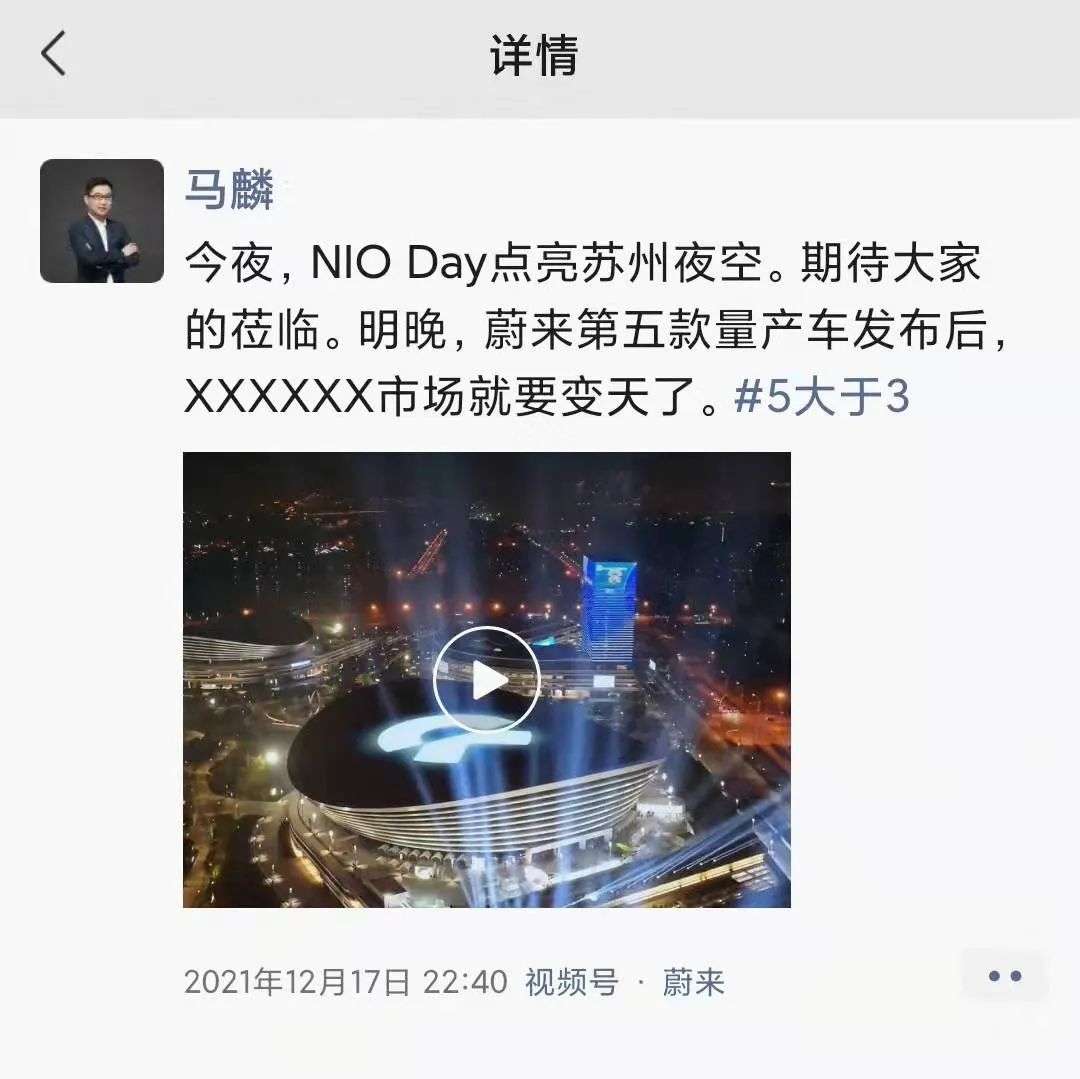 有这样的反应,并不意外,因为在ET5发布之前,火药味就已弥漫出来。就在今年NIO Day的前一天,蔚来传播高级总监马麟在其朋友圈发布了一条信息,表示“明天,蔚来第五款量产车发布后,XXXXXX市场就要变天了。”并且还引用了一个关键词——5大于3。