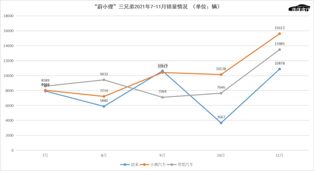 “蔚小理”三兄弟2021年7-11月销量情况,