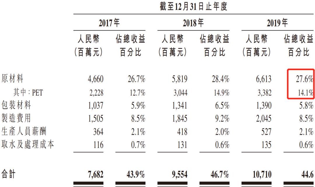 再细看2019年的销售成本分布,其中原材料占比营收的27.6%,扣除掉PET,也就是塑料瓶身,剩下27.6%-14.1%=13.5%