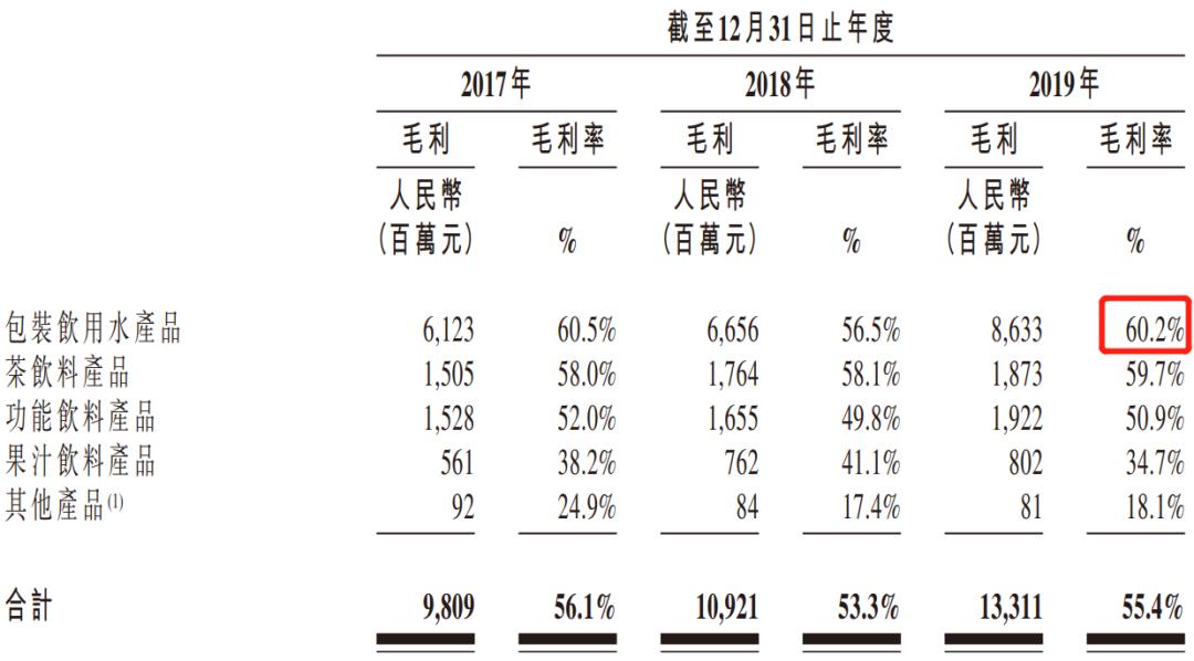 为验证纯净水/矿泉水是不是暴利,我翻看了农夫山泉的招股书,招股书显示其饮用水毛利率达到 60%,为所有饮料中最高。