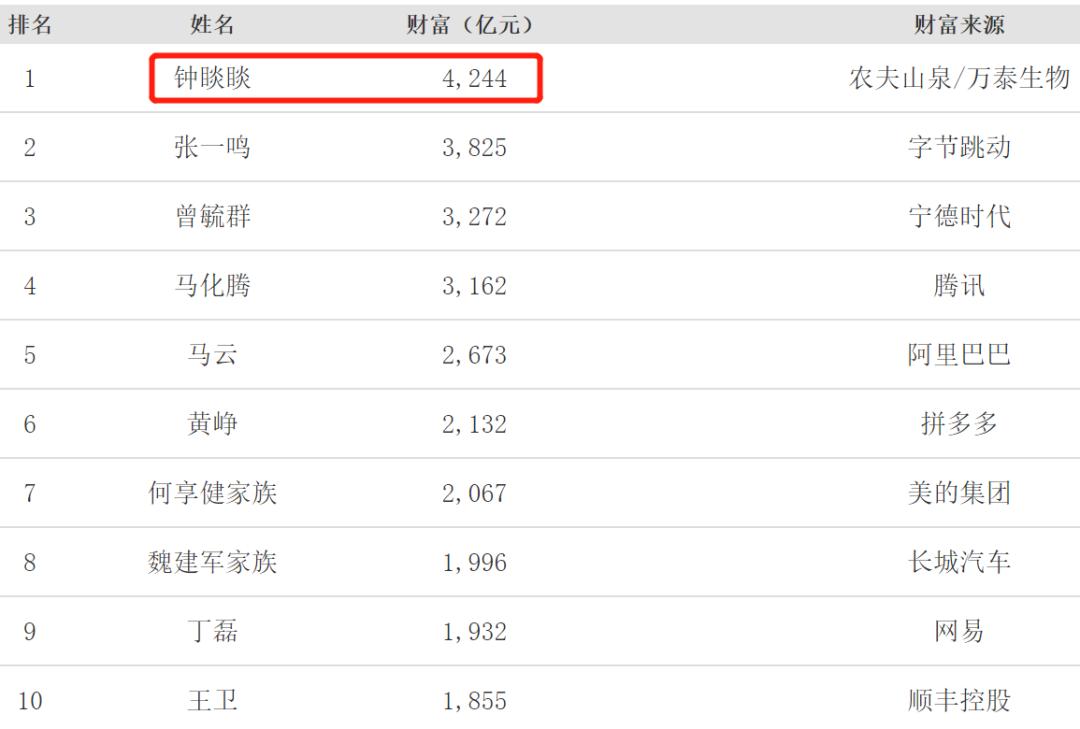 2021年福布斯中国内地富豪榜放榜,农夫山泉创始人钟睒睒成为新一届首富,身家高达4244亿人民币,是马化腾的1.34倍,马云的1.58倍。